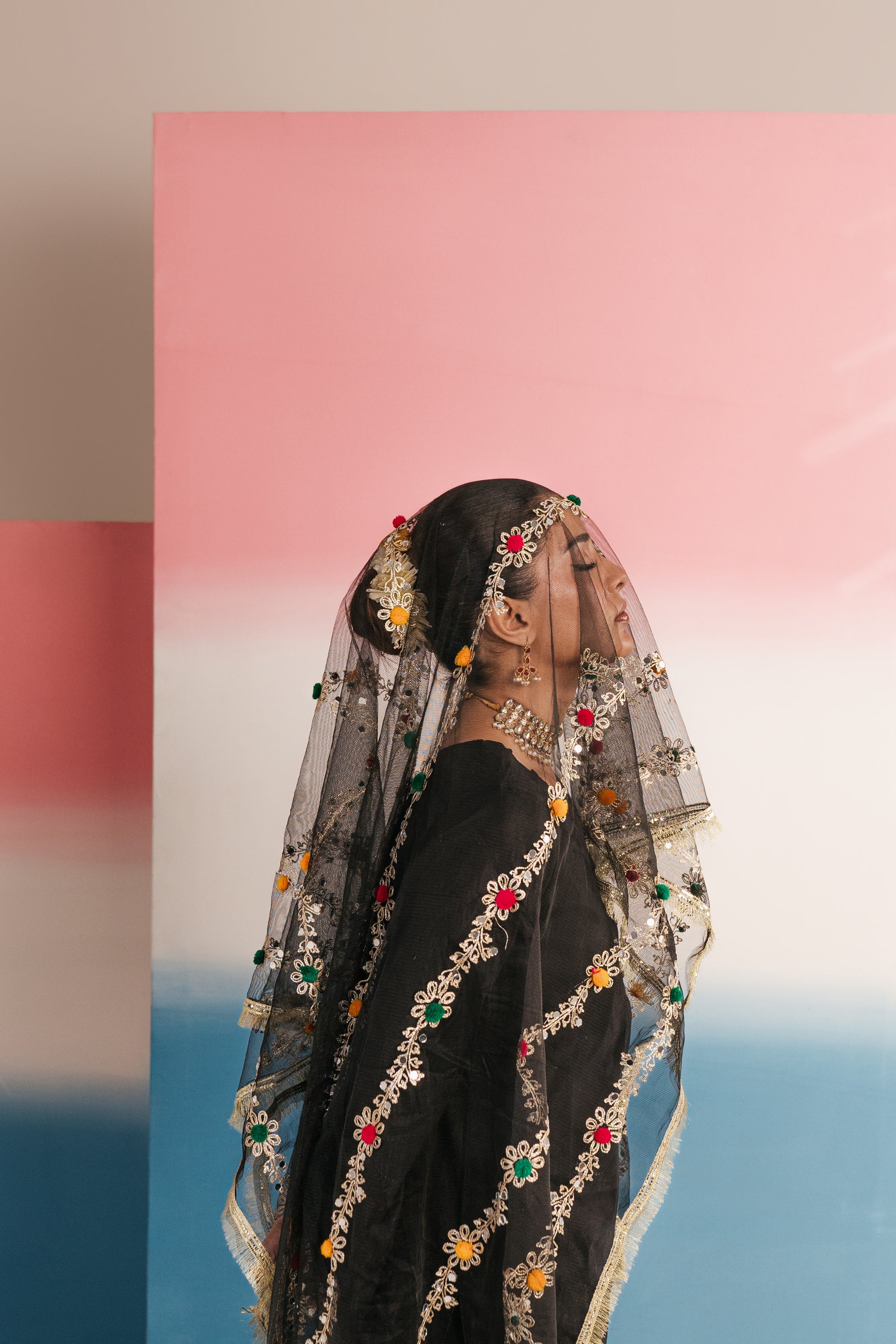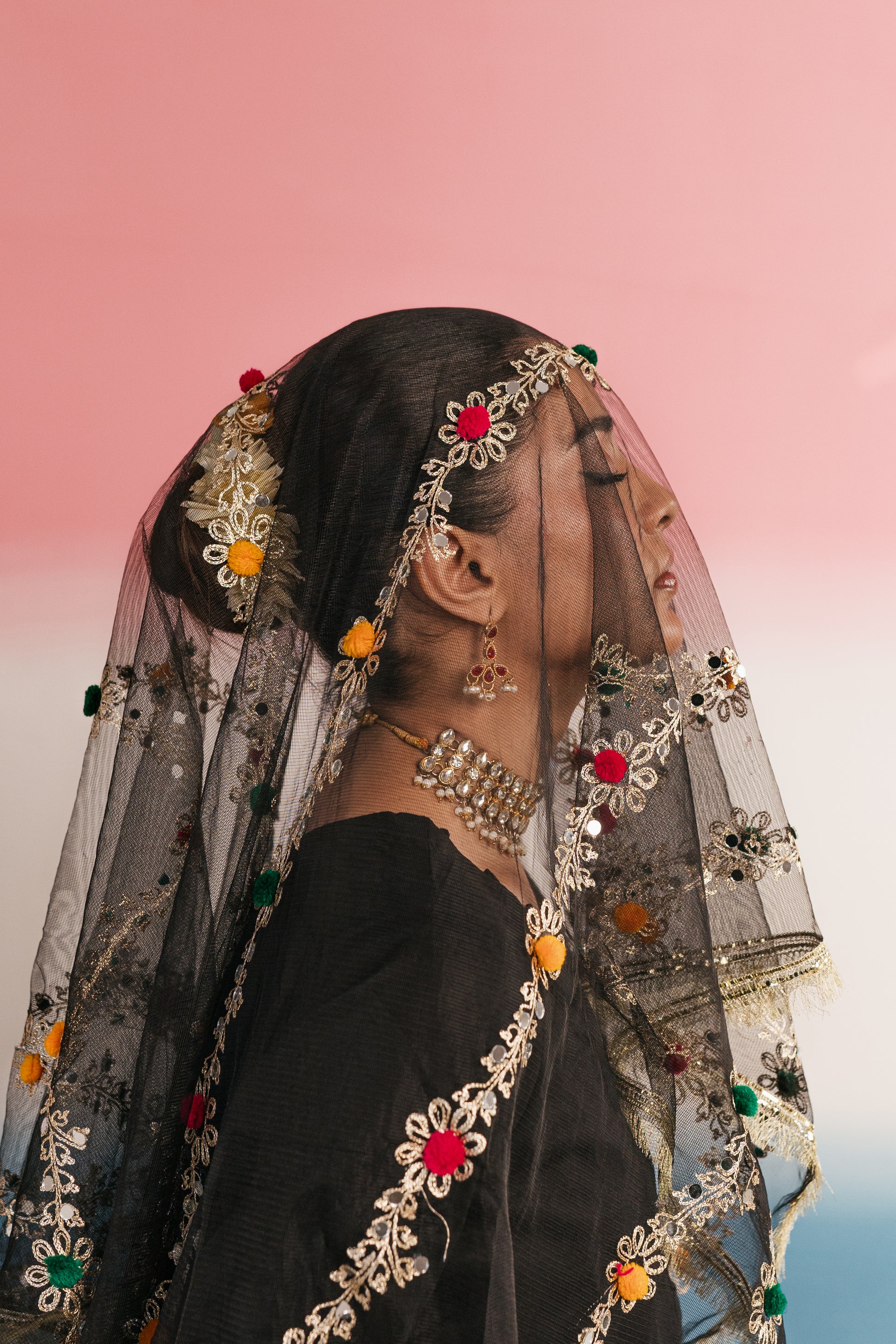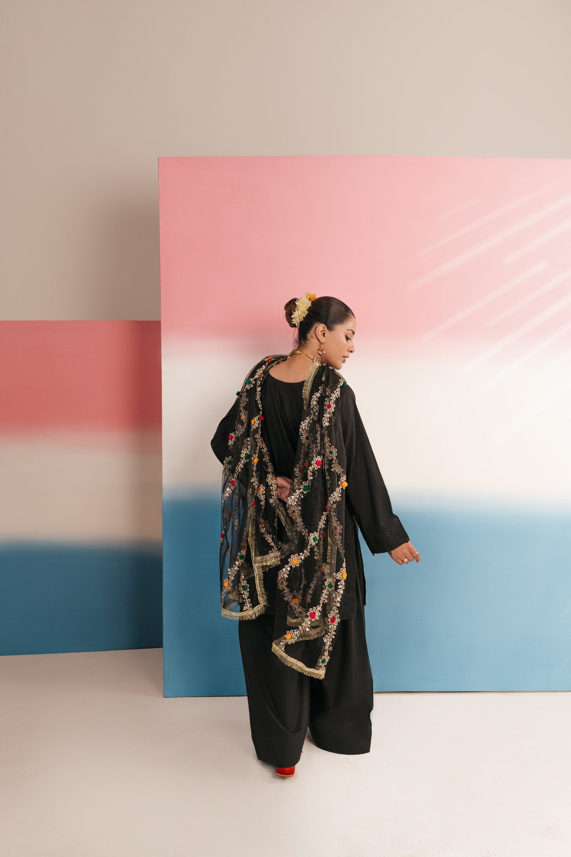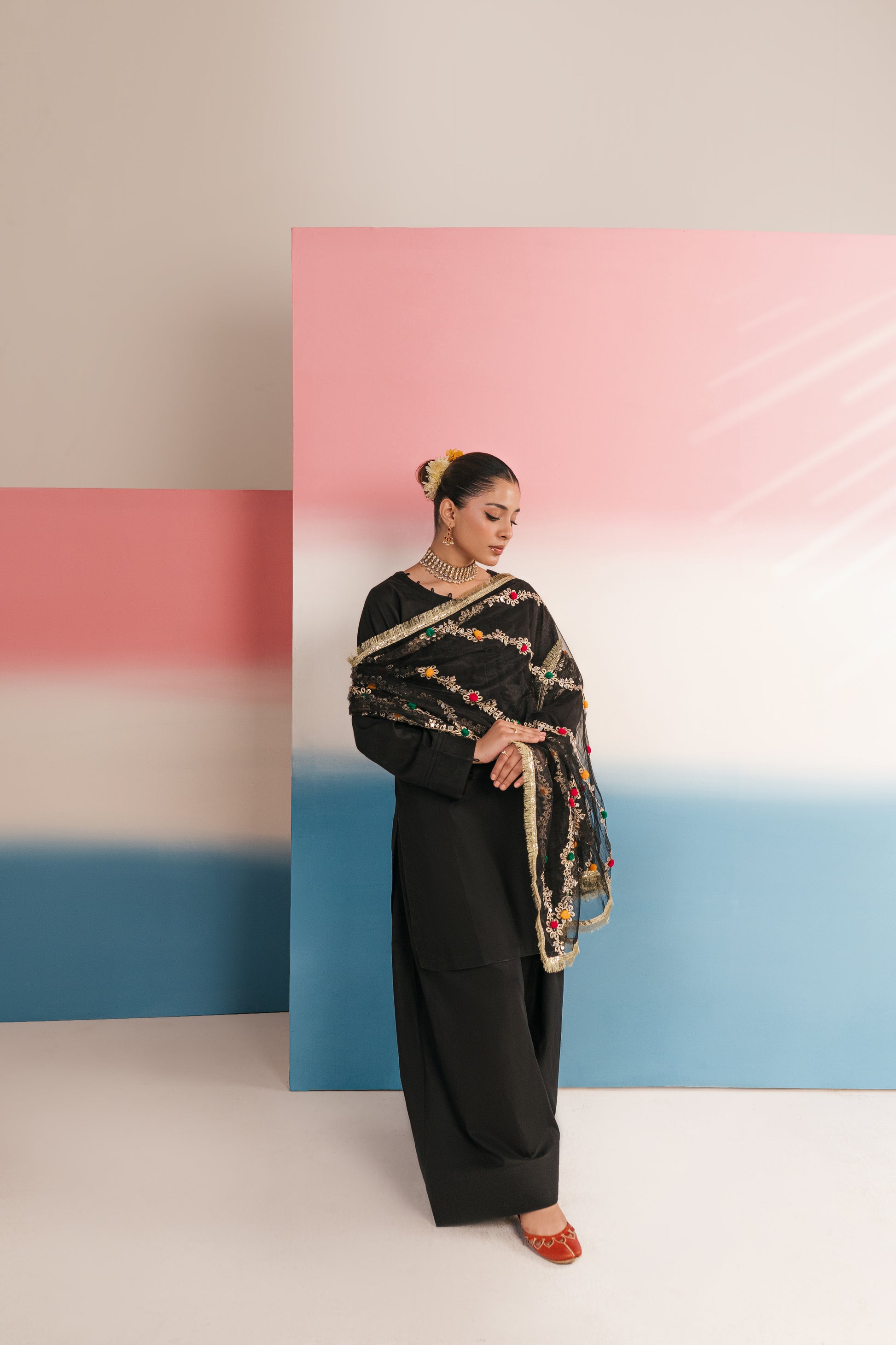 • Dupatta: Statement net dupatta adorned with intricate gota work and colorful thread embroidery, creating floral trails along the length — bordered with shimmering lace for a regal finish