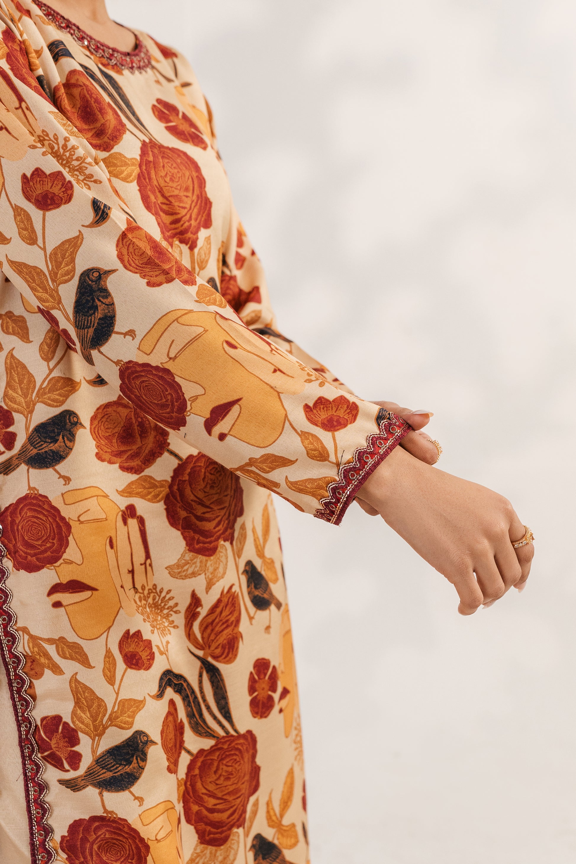 Shirt: Printed lawn shirt with bold rose and abstract motifs, featuring lace accents on both sides, neckline, and sleeves for an elevated finish • Embellishments: Finished with delicate tassels at the neckline, adding a handcrafted touch to the contemporary design